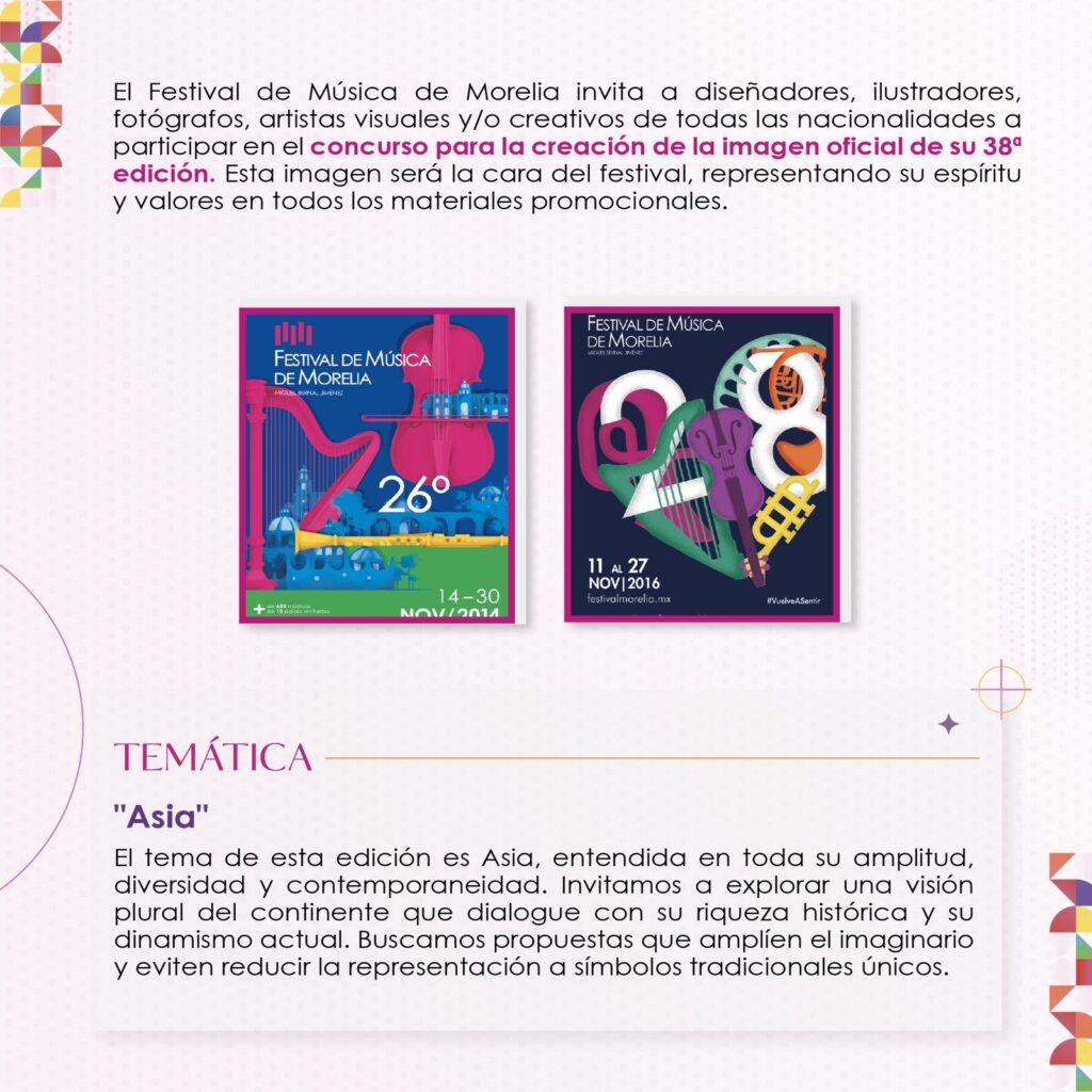 El Festival de Música de Morelia Miguel Bernal Jiménez (FMM) anuncia la apertura de la convocatoria para el diseño de la imagen oficial de su 38ª edición, invitando a diseñadores, ilustradores, fotógrafos, artistas visuales y creativos de todas las nacionalidades a participar en este concurso internacional.